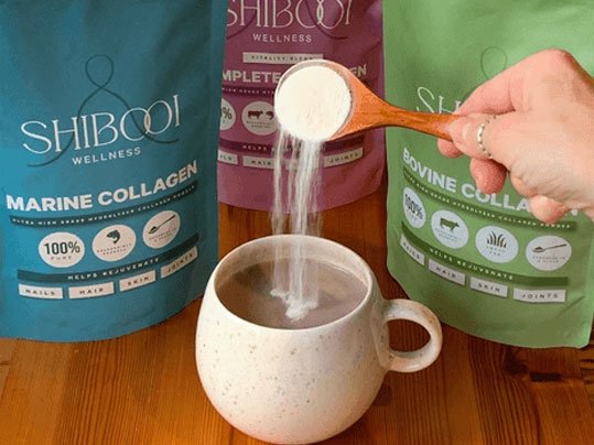 Shibooi Complete Collagen blends bovine, marine, and eggshell collagen with Vitamins C & B6 and Magnesium to support skin, hair, joints, and daily energy.